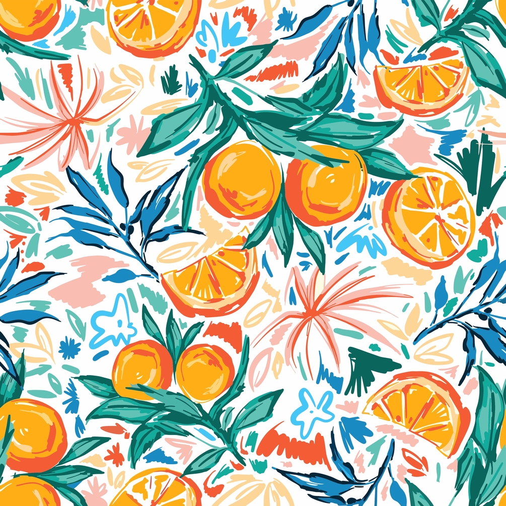 This lively design showcases juicy, sliced, and whole oranges in a repeating layout, perfect for adding a zesty, tropical vibe to packaging, textiles, wallpapers, or digital projects.