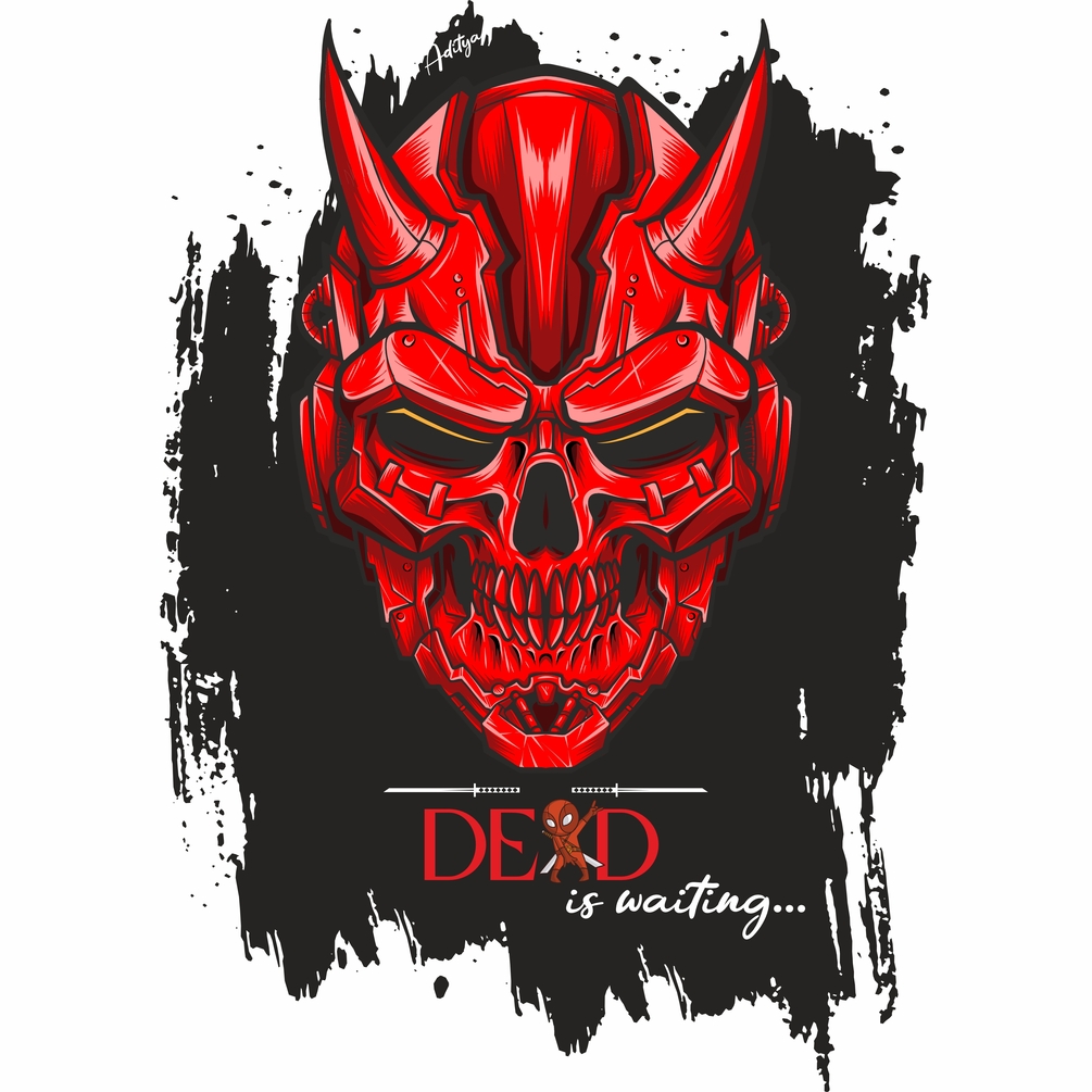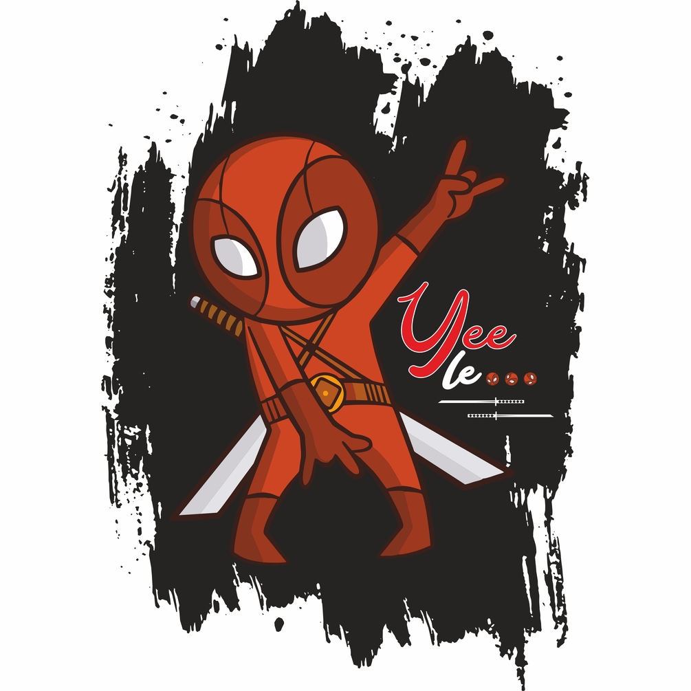 A bold and vibrant red T-shirt design featuring Deadpool in his iconic pose, complete with dual katanas and his signature smirk. The artwork showcases intricate comic-style details, set against a dynamic splash background that enhances the action-packed vibe. Perfect for Marvel fans, this design captures Deadpool's irreverent charm and fearless attitude, making it a standout piece for any casual or fandom wardrobe.