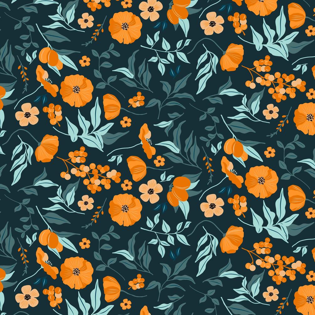 "An elegant orange floral vector pattern featuring intricate blooms and swirling leaves. This seamless design brings warmth and vibrancy, perfect for backgrounds, textiles, wallpapers, and other creative projects. Its harmonious blend of orange hues adds a touch of sophistication and natural beauty."