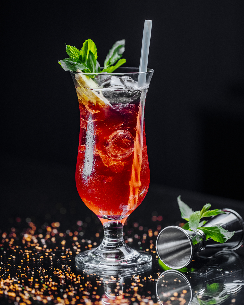 Colorful drinks garnished with fresh fruit, mint leaves, and ice cubes.